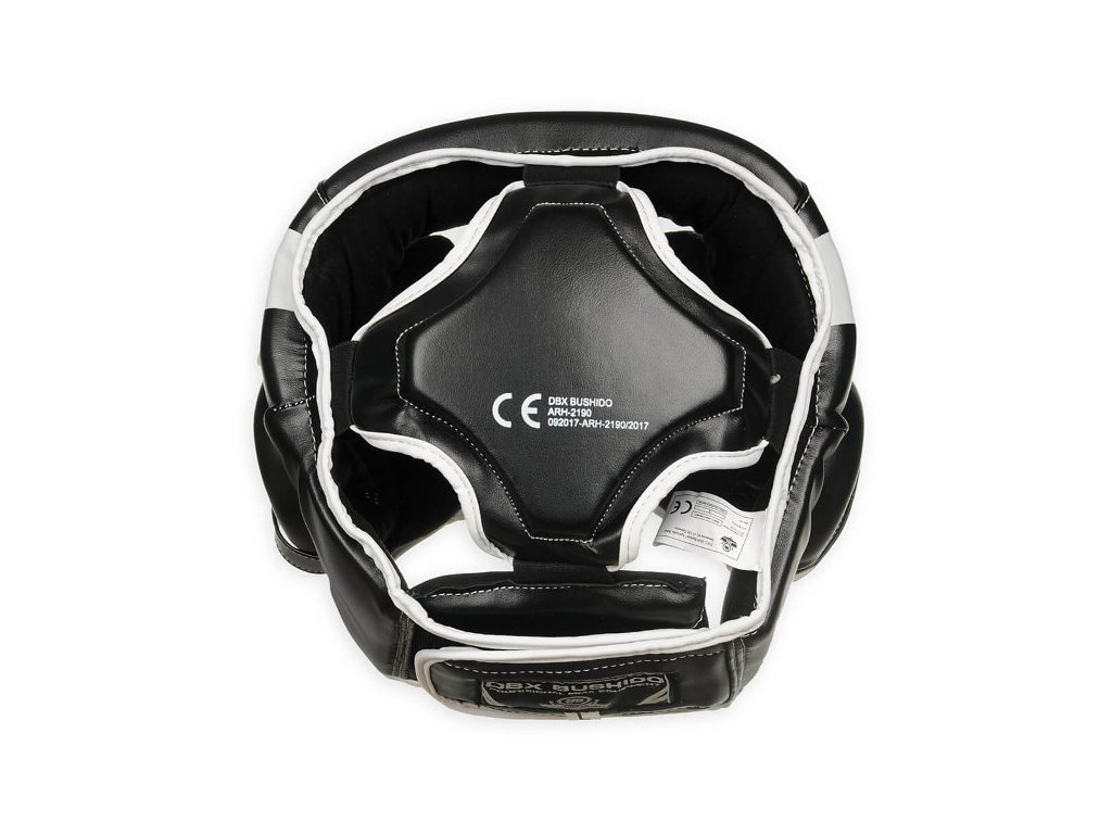 Boxerská helma DBX BUSHIDO ARH-2190 je vyrobena ze zpevněné, umělé kůže a je vyplněna PU pěnou, která dokonale pohlcuje nárazy. Přilba je navržena v souladu s bezpečnostními standardy a zajišťuje tak bezpečnost a komfort během zápasu, tréninku či nácviku se sparing partnerem. Tvar helmy je navržen tak, aby byly chráněny lícní kosti, oči, nos a uši. Zpevnění v oblasti čelisti jí poskytuje větší stabilitu a napomáhá předcházet jejím zraněním. Helma je vyrobena z umělé kůže se zvýšenou elasticitou. Uvnitř je vyplněna pěnou vysoké hustoty a povrch je upraven tak, aby nenasával pot. Díky tomu odolává praskání a snadno se udržuje. Ze zadní strany je široký pás se suchým zipem, který zaručuje, že helma bude na hlavě přesně sedět.