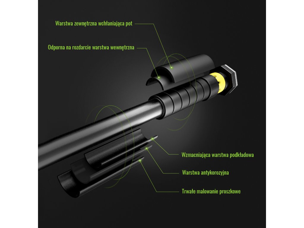 Koncovky hrazdy jsou opatřeny vrstvou silikonu, který zamezuje sesunutí hrazdy ze svého místa, pro ještě pevnější instalaci jsou součástí balení 2 gumové zarážky, které se našroubují do zárubní a hrazda se nasadí na ně. Speciální, žlutá objímka je posuvná a zamezuje povolení dotažené hrazdy. Pěnové návleky jsou opatřeny vrstvou, která odvádí pot a tím zamezuje sklouznutí dlaně. Ocelová konstrukce je ošetřena základovou barvou, antikorozní vrstvou a práškovým lakem.