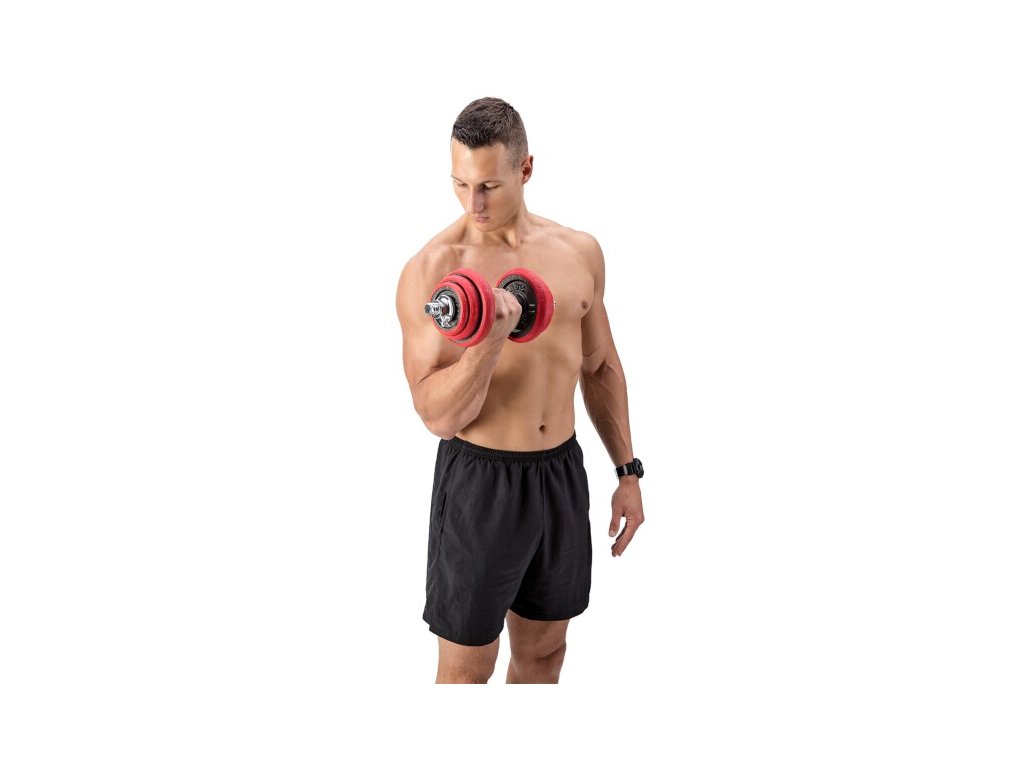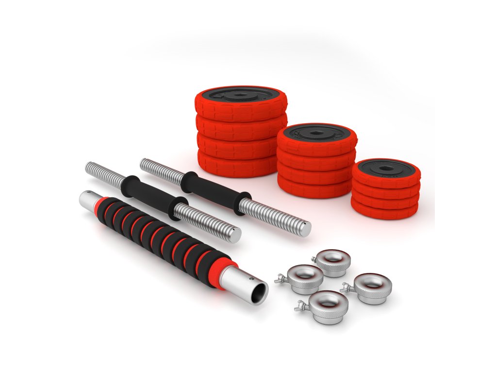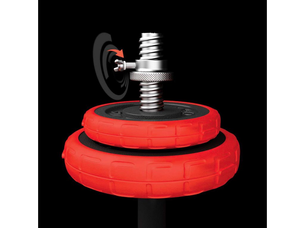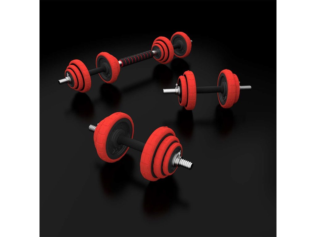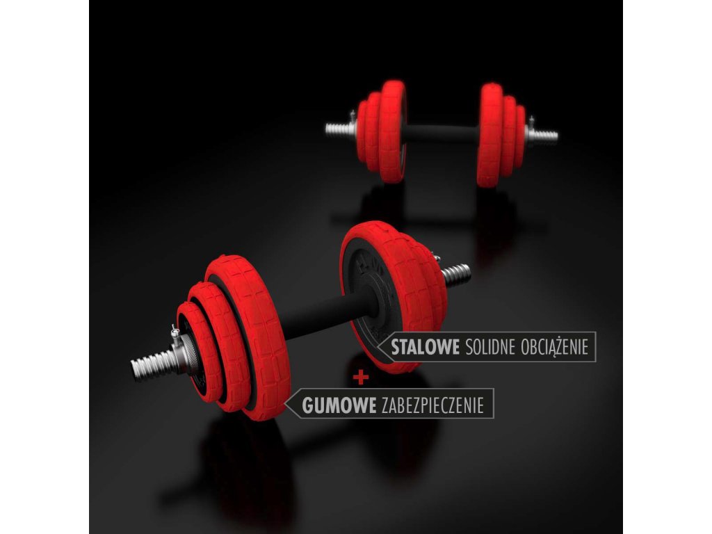 Činky jsou vyrobeny z vysoce kvalitní, lité oceli, která je zárukou dlouhé životnosti. Kotouče jsou opatřeny gumovým návlekem, který chrání jak činky, pak podlahu před poškozením při neopatrném odložení. Proti posunutí závaží se činky zajišťují šroubovacími zámky, které jsou dodatečně jištěny šroubem.