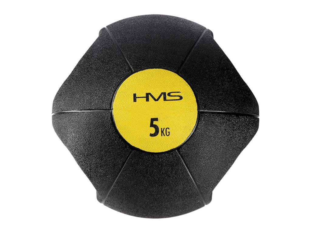 Medicinbal HMS NKU05 je vyroben z hrubé a pevné gumy vyplněné pískem. Díky úchytům jde o kombinaci medicinbalu a činky.