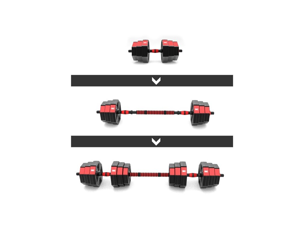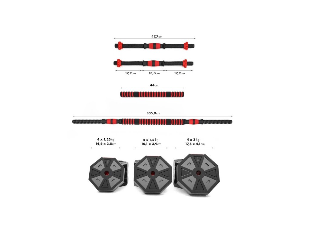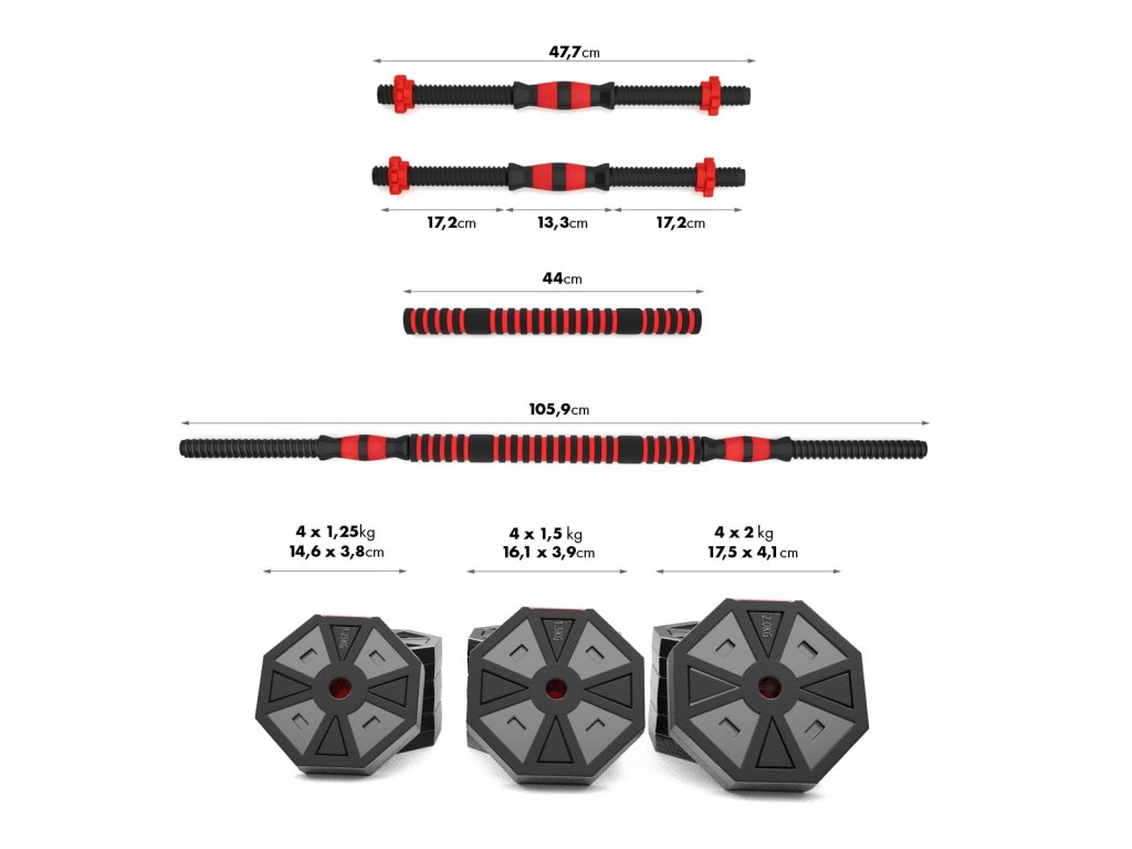 Kotouče jsou vyrobeny z trvdého plastu, který je vyplněn cementem. Obouruční osa je spojovacím dílem, do kterého se všroubují hřídele jednoručních činek. Nakládací trny jsou opatřeny závitem a závaží se zajišťuje pomocí hvězdicových matic. Šestihranný tvar kotoučů navíc zamezuje jejich odvalování. Činky se Vám tak nikam neodkutálí a budete je mít vždy tam, kde jste je odložily.