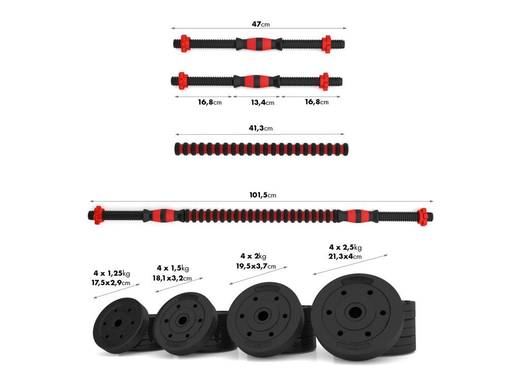 Kotouče jsou vyrobeny z trvdého plastu, který je vyplněn cementem. Obouruční osa je spojovacím dílem, do kterého se všroubují hřídele jednoručních činek. Nakládací trny jsou opatřeny závitem a závaží se zajišťuje pomocí hvězdicových matic.