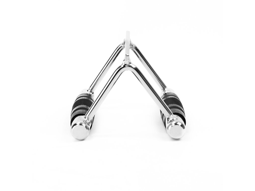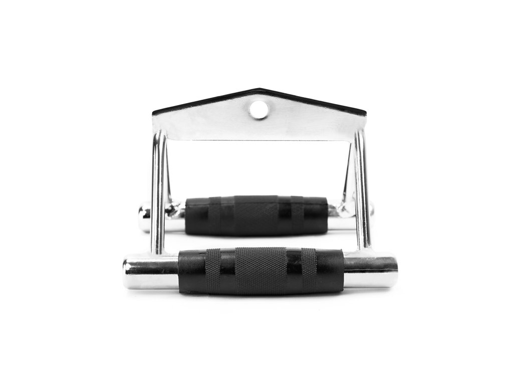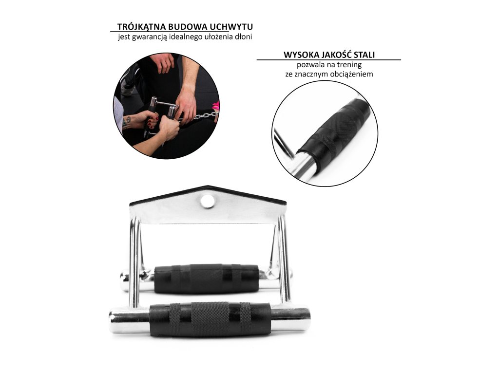 Trojúhelníková konstrukce úchopu zaručuje dokonalou polohu ruky a zároveň nutí ke správnému pohybu při cvičení. Pogumovaná rukojeť zajišťuje bezpečné držení a zabraňuje vyklouznutí adaptéru z ruky a zároveň vyžaduje pevnější úchop. Tímto způsobem také pracujeme na rozvoji svalů předloktí. Nepříliš široká rozteč rukojeti, usnadňuje udržení správné dráhy pohybu, tj. vedení loktů v blízkosti trupu. Adaptér UW04 je vyroben z kvalitní chromované oceli, která umožňuje trénink se značnou zátěží.