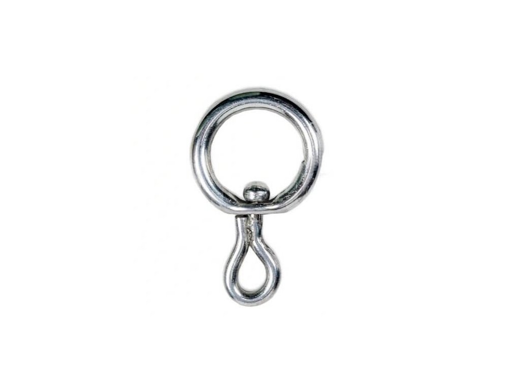 Svařované, otočné očko ze silného ocelového drátu o průměru o 7 mm. Očko je otočné o 360°a zabraňuje zamotání řetězů nebo lan připevněných ke kroužku.