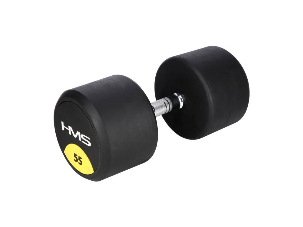 55-ti kilogramová jednoruční činka HMS HG Pro je určená pro profesionální použití jak doma tak v posilovně. Závaží tvoří litinový odlitek pokrytý silnou vrstvou gumy, která ochrání jak činku, tak podklad před poškozením. Na čelní straně je značka HMS a údaj o hmotnosti v kilogramech. Rukojeť je vyrobena z chromované oceli, pro pohodlný úchop má soudkovitý tvar s vroubkovaným povrchem.