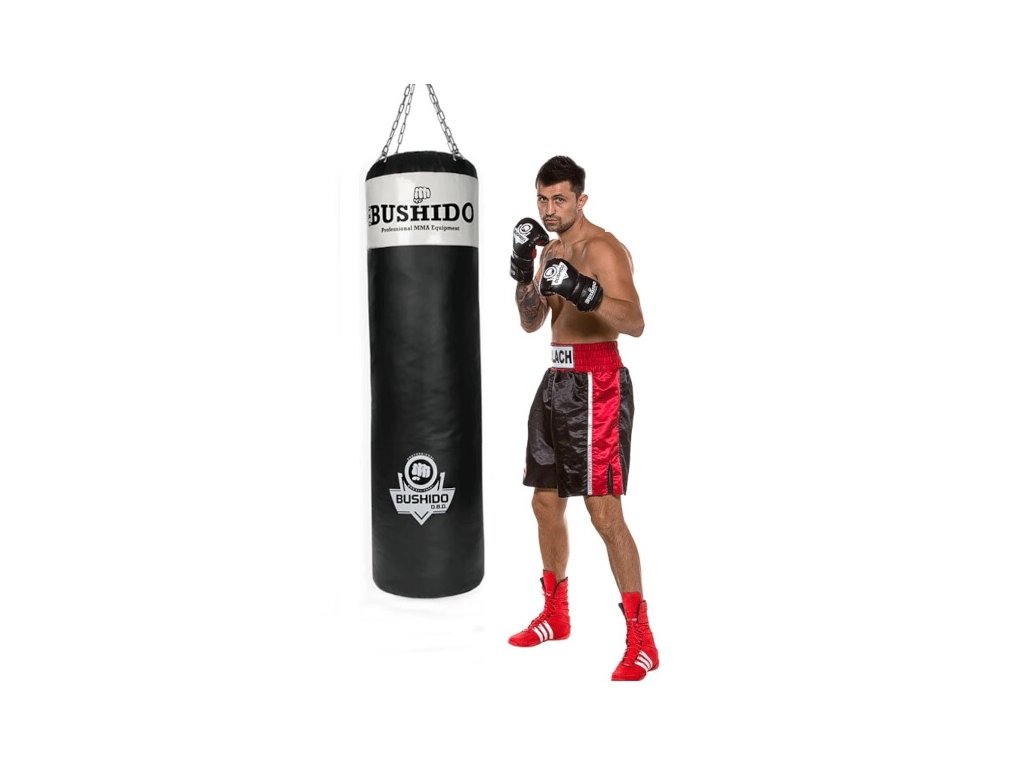 Profesionálne boxovacie vrece DBX BUSHIDO 160 x 40 cm. Dĺžka reťazí pri zavesení 45 cm (vďaka karabíne je možné nastaviť aj kratšiu dĺžku).