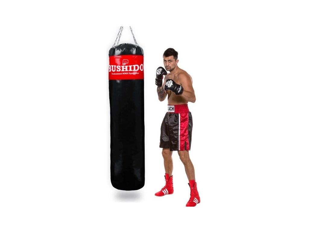 Profesionálne boxovacie vrece DBX BUSHIDO 180 x 45 cm. Dĺžka reťazí pri zavesení 45 cm (vďaka karabíne je možné nastaviť aj kratšiu dĺžku).