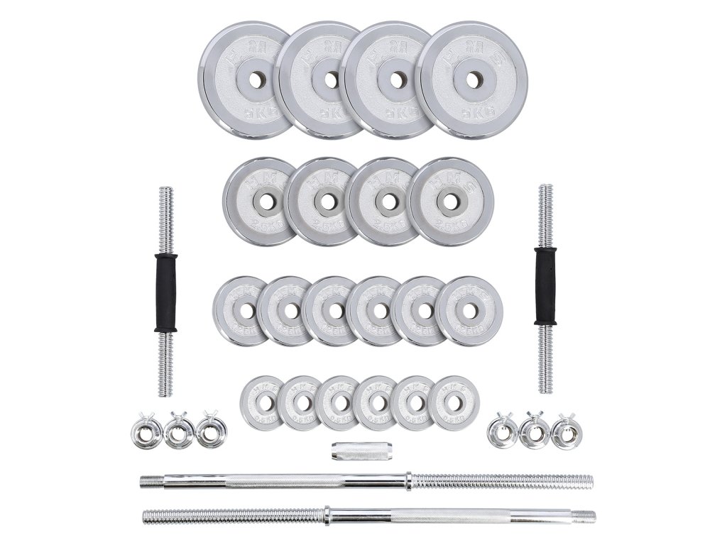 Obojručnú os tvoria tri časti, v podstate ide o 2 polovice, ktoré sa vskrutkujú do stredného, vrúbkovaného dielu, tým nám vznikne klasická, obojručná os, ktorá sa od pevného hriadeľa líši iba nepatrne širším stredom. Súprava HMS STC50 je prvým modelom z našej ponuky, ktorý umožňuje toto riešenie, ktoré šetrí náklady a miesto vo Vašej domácej posilňovni. Sada obsahuje 2 krátke, nakladacie osi opatrené ergonomickým úchopom, 2 časti obojručnej osi, spojovací diel, 6 zámkov a 20 kotúčov.