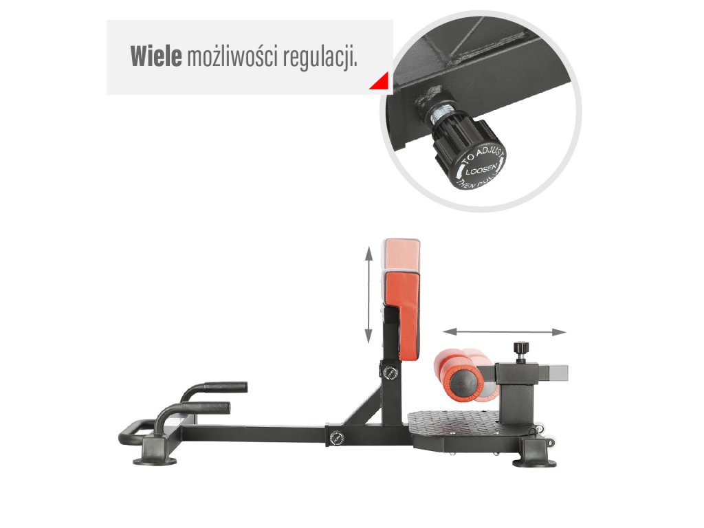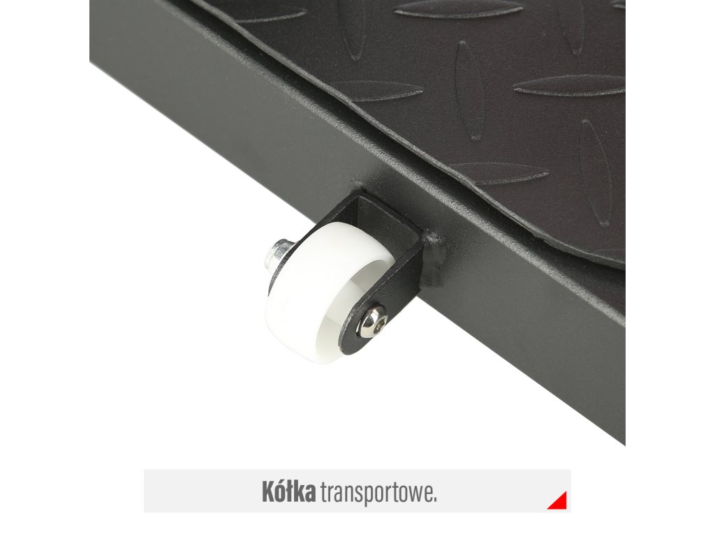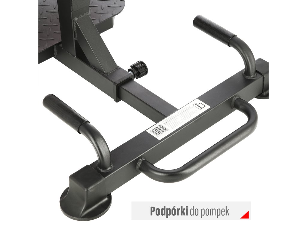 Robustná oceľová konštrukcia stojí na plastových koncovkách, ktoré chránia podlahu pred poškodením a zároveň zaisťujú vysokú stabilitu lavice. Predný stabilizátor je osadený transportnými kolieskami, zatiaľ čo zadný stabilizátor je opatrený uchom pre ľahké presunutie lavice, pokiaľ ju práve nepoužívate. Zadnú časť rámu ide zasunúť, aby lavica zaberala skutočne minimum miesta. Platforma je vyrobená z drážkovaného plechu, ktorý zamedzuje kĺzaniu topánok. Na polstrovanie je použitá hrubá doska, s vysokou vrstvou PU peny pre maximálny komfort, PU pena je taktiež použitá na zarážky nôh.