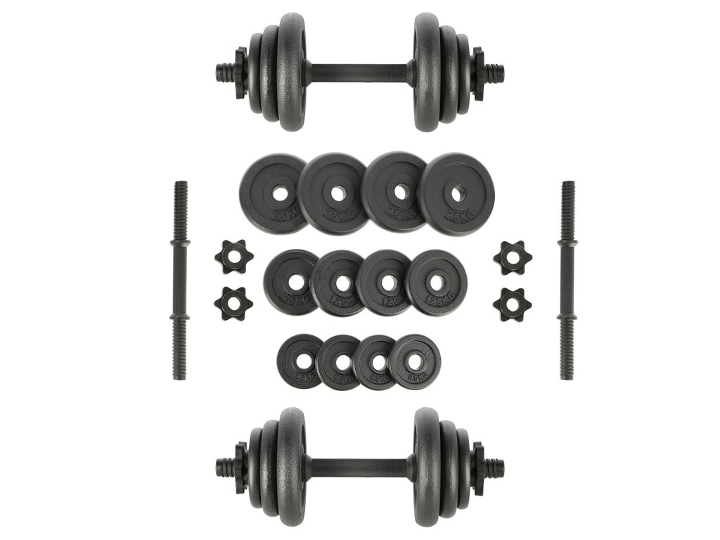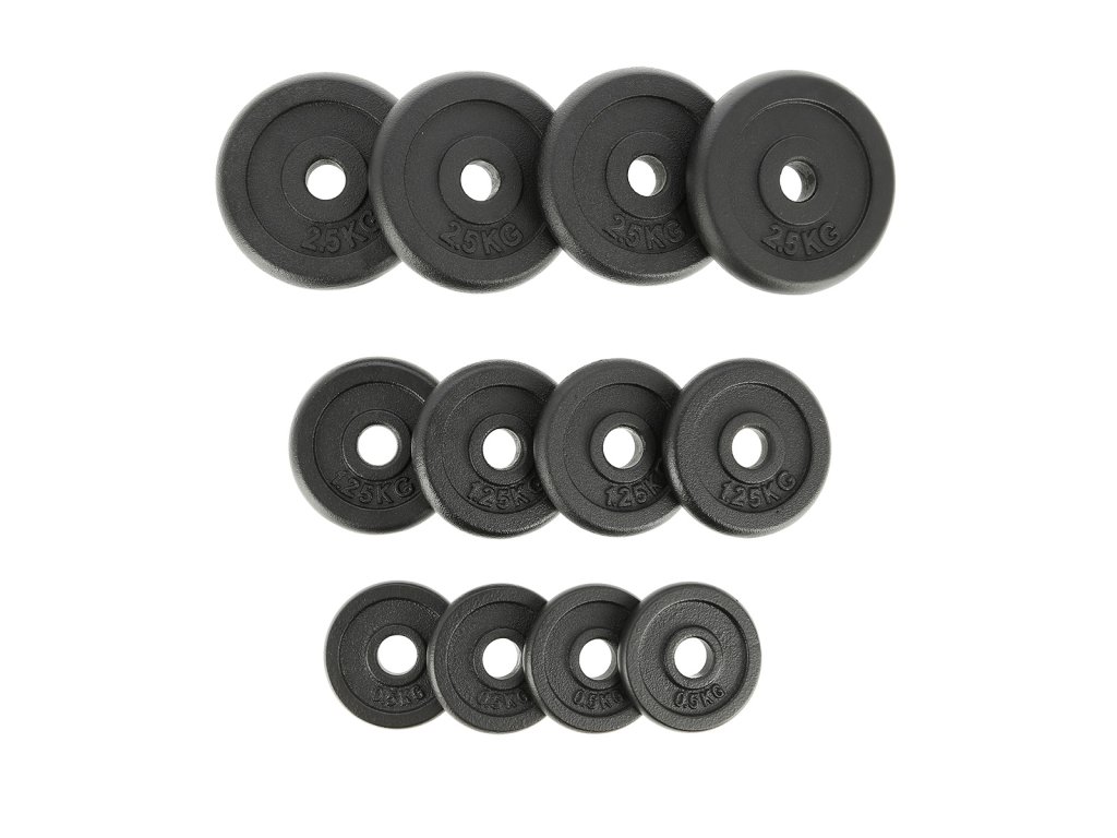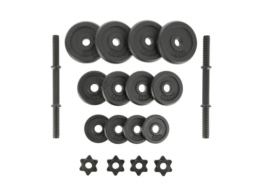 Sada jednoručních činek v kufříku. Kufřík obsahuje 2 jednoruční hřídele, sadu kotoučů. 4 kusy matek. Díky balení v plastovém kufříku, lze činky jednoduše přenášet a skladovat.