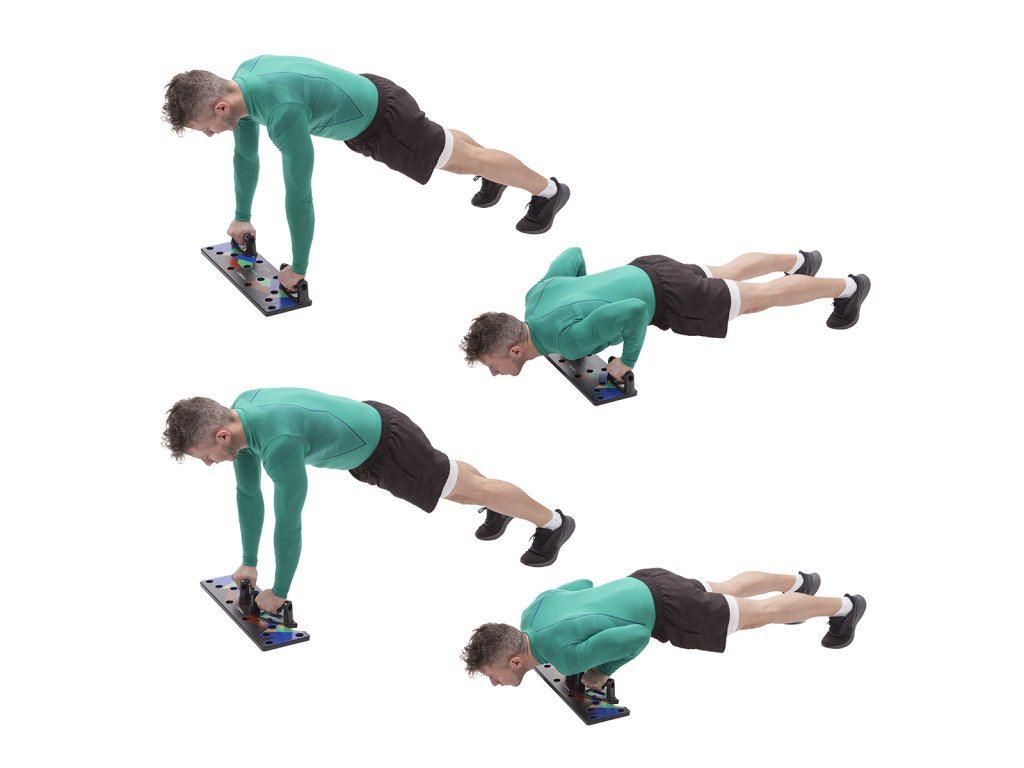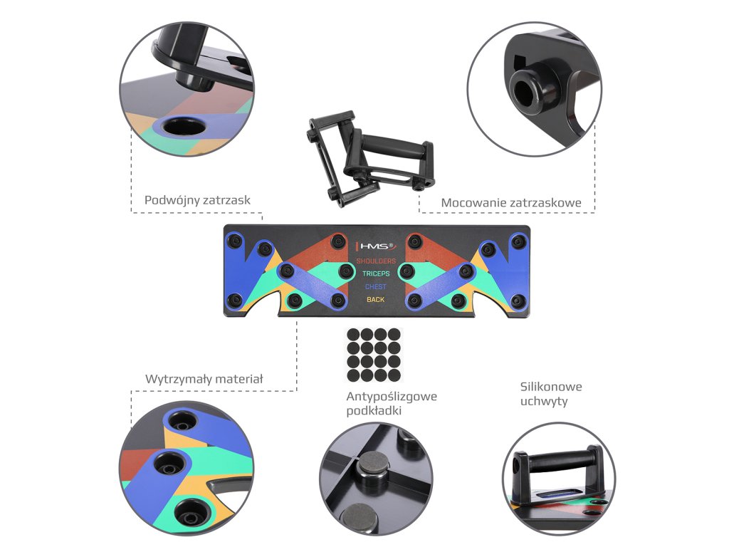 PU10 HMS je multifunkčná, skladacia doska, ktorá umožňuje variabilný tréning klikov. Doska je symetricky rozdelená na 2 polovice. PU10 obsahuje 5 párov otvorov na umiestnenie dodávaných podpier. Každý pár otvorov umožňuje tréning pod iným uhlom, kedy sa precvičuje iná svalová skupina a to:
