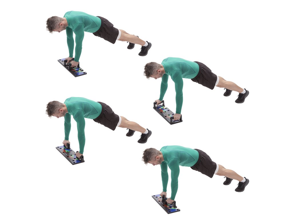 - pri umiestnení podpier do odtieňov modrých otvorov budete počas klikovania precvičovať prsné svaly