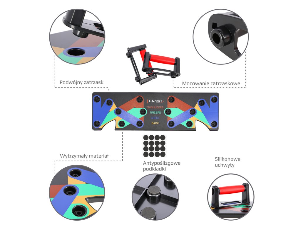 PU10 HMS je multifunkčná, skladacia doska, ktorá umožňuje variabilný tréning klikov. Doska je symetricky rozdelená na 2 polovice. PU10 obsahuje 5 párov otvorov na umiestnenie dodávaných podpier. Každý pár otvorov umožňuje tréning pod iným uhlom, kedy sa precvičuje iná svalová skupina a to: