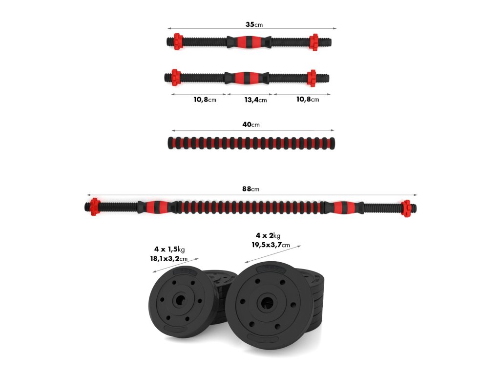 Sada obsahuje 1 spojovací díl, 2 jednoruční hřídele, 4 hvězdicové matice a celkem 8 kotoučů různých vah.