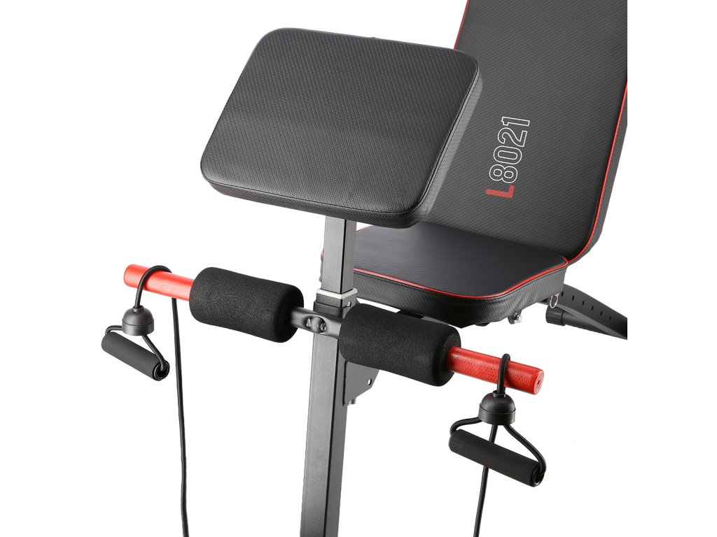 Ocelová konstrukce má nosnost 150 kilogramů a lze ji snadno složit, takže nezabere mnoho místa, pokud lavici zrovna nepoužíváte. Hmotnost L8021 je 9,5 kilogramů. Sedák a opěry jsou potaženy odolnou, syntetickou kůží s neklouzavým povrchem. Zádová opěra je nastavitelná do 7-mi poloh v rozsahu od -20° do 90°. Bicepsovou opěru je možné výškově nastavit do 2 poloh. Stabilizátory lavice jsou osazeny gumovými koncovkami, které lavici udrží pevně na svém místě. Na přední noze se nacházejí poutka k zaháčení dodávaných gumových lan pro trénink paží.