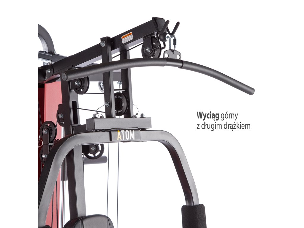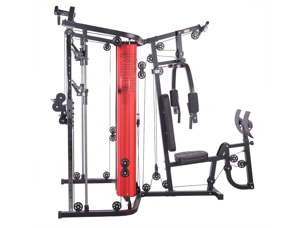 ATOM v sebe snúbi multipress, dve posuvné kladky, rameno na tlaky/motýlika, leg press a hrazdu, takže ide o skutočne komplexný stroj. Súčasťou dodávky je aj dvojité, tricepsové lano, tricepsový adaptér, popruhy ku kladkám a opasok na členok.