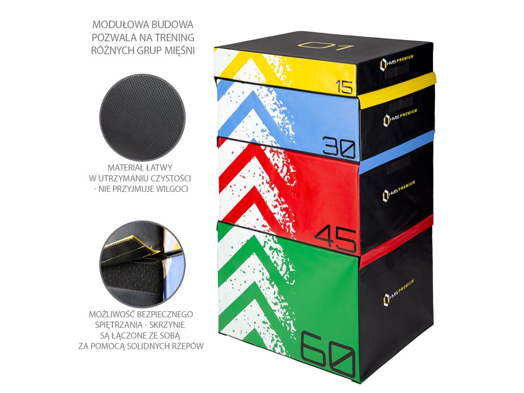 HMS Premium PYBS01 je sada štyroch mäkkých, šesťhranných plyometrických skríň s rôznou výškou.