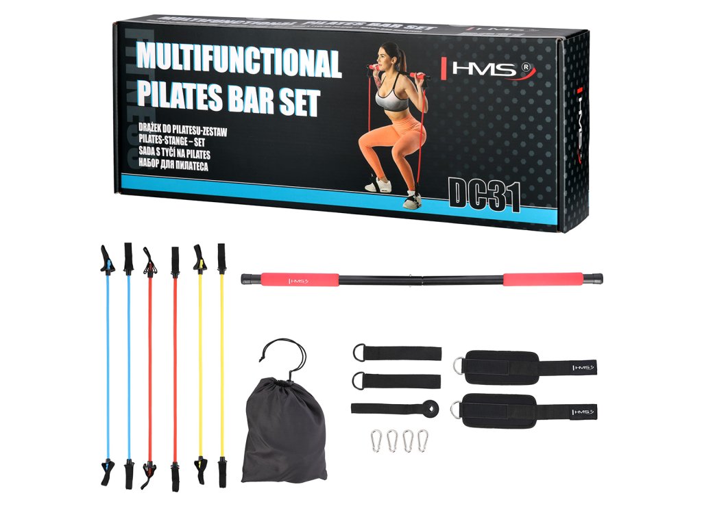 Zostava s tyčou na pilates HMS DC31 obsahuje sadu expandérov, zarážku za dvere a 2 páry popruhov, vďaka tomu umožňuje vykonávať širokú škálu cvikov. Do istej miery dokáže zastúpiť odporové gumy a gumy Thera Band. Model HMS DC31 nájde svoje uplatnenie pri akomkoľvek tréningu a pri rehabilitácii. Posilňovacia tyč sa využíva na tréning horných a dolných svalových partií. Tréning s DC31 zvyšuje mobilitu a zlepšuje koordináciu.