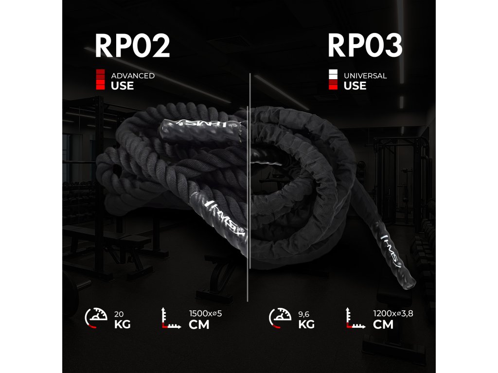 Lano HMS RP03 je skvelou pomôckou na rozvoj sily, kondície, vytrvalosti a výbušnosti. Takzvaný Battle Rope je veľmi obľúbené medzi priaznivcami funkčného tréningu. Tiež je veľmi vhodným doplnkom na posilnenie horných častí tela, najmä ramien a paží. Lano je veľmi efektívnou pomôckou pre tréning bojových športov. Na konci je vybavené ochrannými krytmi pre lepšie uchopenie. Posilňovacie lano HMS RP03 zlepšuje koordináciu, vytrvalosť a zmysel pre rovnováhu.