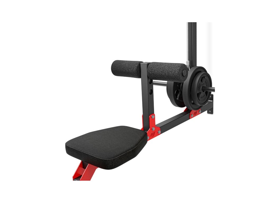 Robustní, ocelové nášlapy slouží k zapření během tréninku se spodní kladkou a zároveň zamezují zvedání konstrukce. Zarážka nohou je nastavitelná do 3 úrovní a je osazena válci z EVA pěny pro maximální komfort. Pohodlné polstrování je vyrobeno ze syntetické kůže.